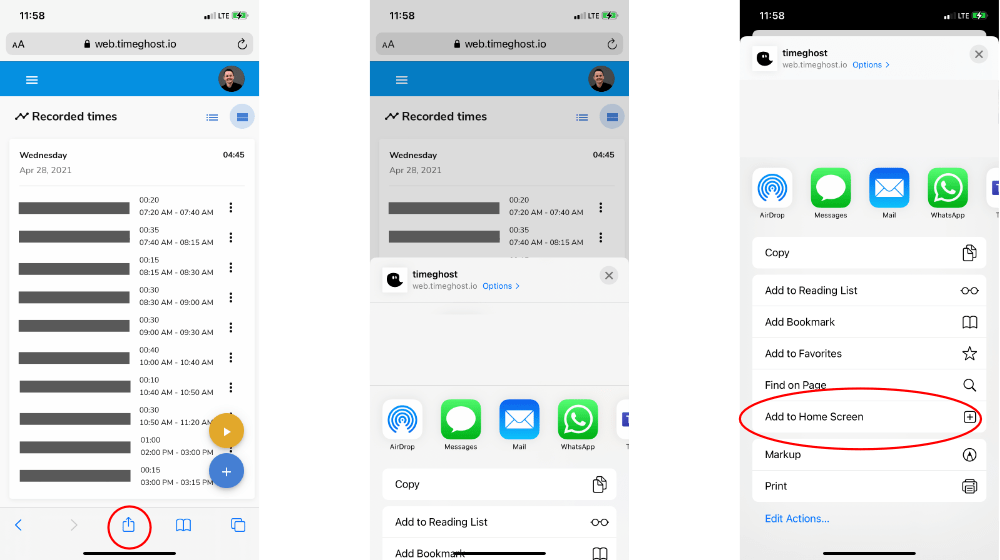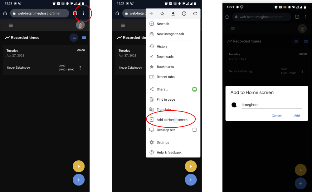 Now select “Add to Home Screen” and a Progressive Web App of timeghost will be installed on your phone and you can use it like any other app.