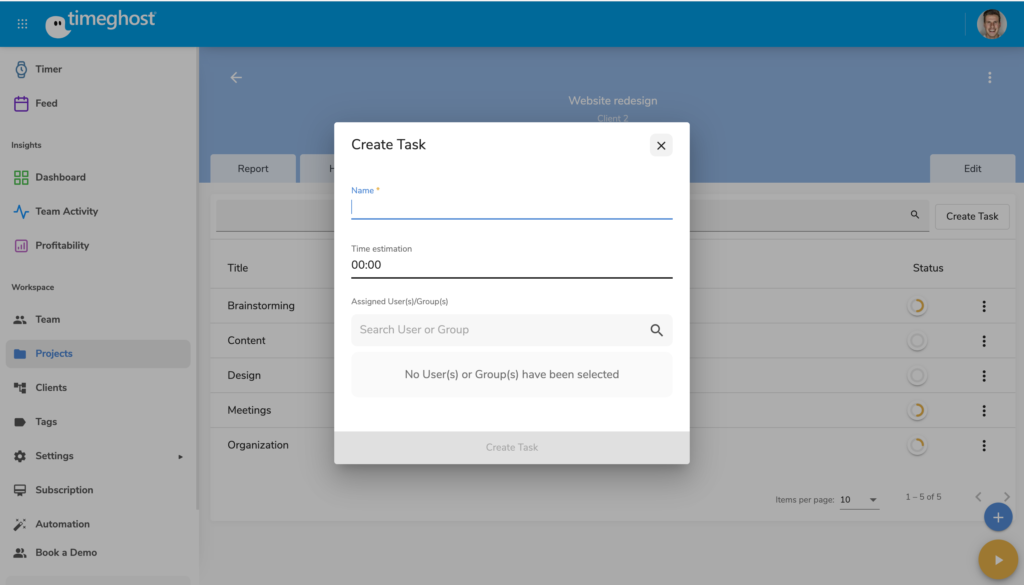 In each project you can create tasks. This way you can specify the content of your project in timeghost and you can better adapt the project during the execution and evaluate it afterwards. You can add a time budget to the tasks, which indicates how long you want to work on this task. This gives you, and in the end also the customer, a better calculability, concerning hours, but also concerning costs in the end.