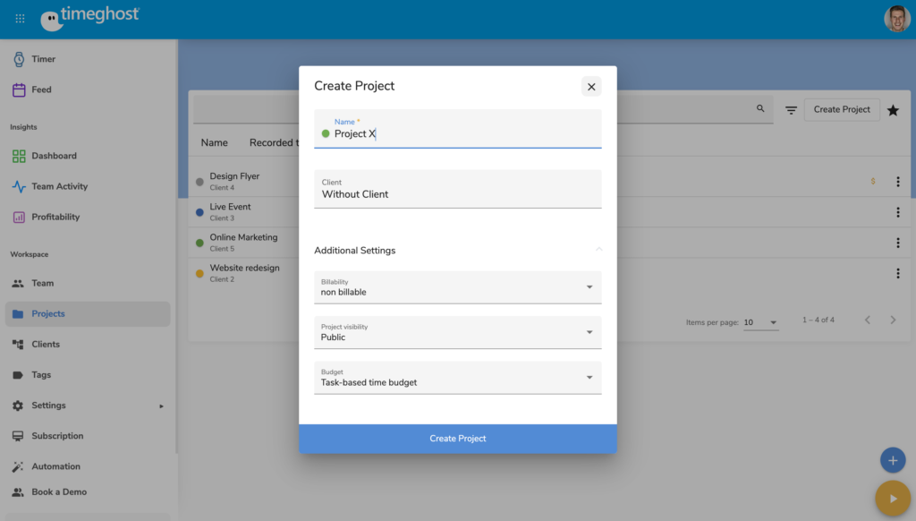 In timeghost you can create all the projects that your team is currently working on. This gives you the possibility to see later in the dashboard how many hours you have worked on which project. In addition, you can update your client on the progress of the project through the recorded times by exporting the project as an Excel or CSV file.