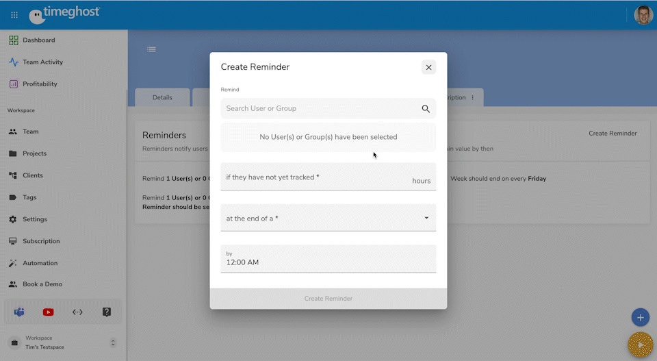 Setting timeghost Reminders is straightforward and intuitive. Go to the “Reminders” section under “Settings”. Then click on “Create reminder” on the right side.