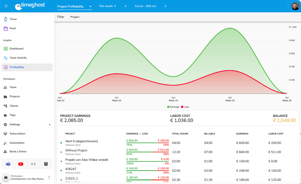 Die Möglichkeit, Projektarbeitszeiten in timeghost als abrechnungsfähig oder nicht abrechnungsfähig zu buchen, bietet dir einen transparenten Umgang mit der Profitabilität deiner Projekte. Lege Stundensätze für deine Mitarbeiter fest und bekomme in timeghost angezeigt, wie viele Einnahmen und Ausgaben du für welches Projekt hattest. Das wird dir übersichtlich in der timeghost Profitabilität angezeigt.